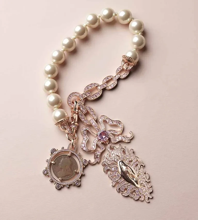 Από το πρώτο της κατάστημα στην King’s Road στο Λονδίνο το 1971, η Westwood έδειξε ότι τα κοσμήματα δεν ήταν ποτέ μόνο στοιχεία ενός outfit. Οι αλυσίδες που κρέμονταν από T-shirts, τα safety pins που στόλιζαν πρόσωπα και ρούχα, τα κολιέ με σπασμένες πέρλες ή φτιαγμένα από κόκαλα κοτόπουλου με λέξεις όπως “Rock”, “Perv” και “F*ck”, αποτέλεσαν τον πρόλογο μιας αισθητικής που έμελλε να γίνει παγκόσμιο σημείο αναφοράς.