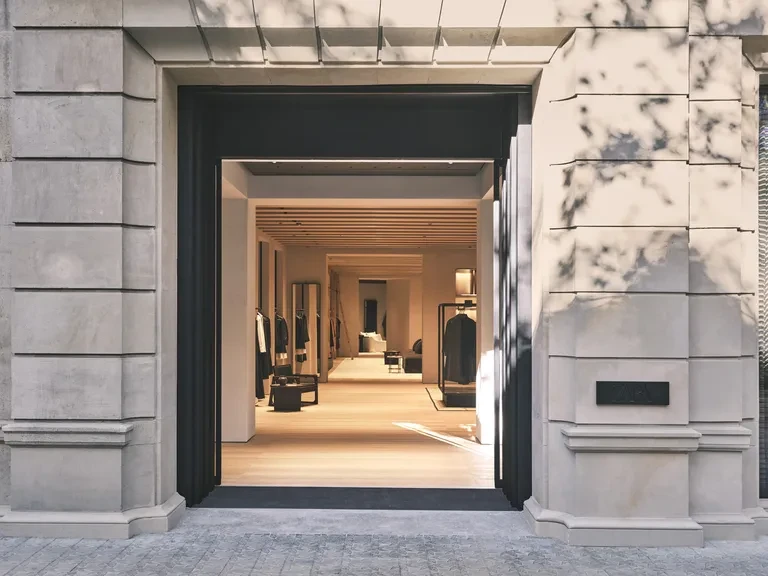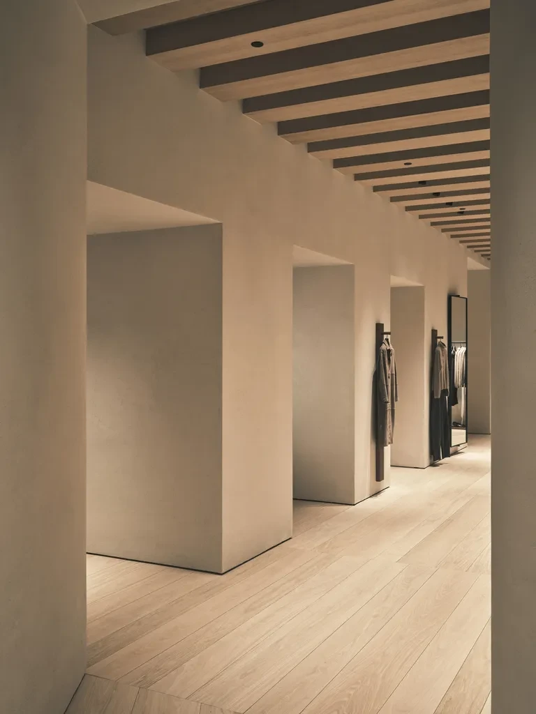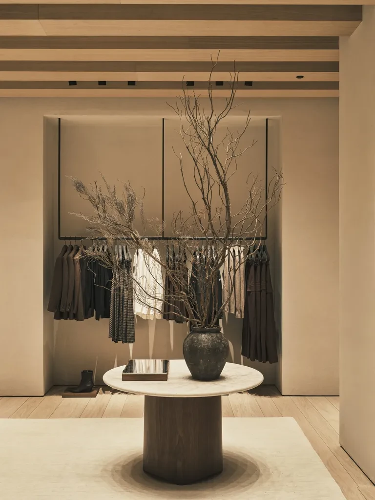 Για τη clothing σειρά και να με σκοπό να αναδειχθούν στον χώρο, ο designer δημιούργησε λεπτεπίλεπτες μεταλλικές ράγες και γυάλινες προθήκες ώστε ορισμένα κομμάτια να παρουσιάζονται με μια σχεδόν μουσειακή ευαισθησία. Τα δοκιμαστήρια έχουν σχεδιαστεί ως ήσυχα προσωπικά καταφύγια, εκεί όπου «ο ρυθμός των θυρών και των περασμάτων δημιουργεί μια αίσθηση ιδιωτικότητας, μετατρέποντας τη δοκιμή ρούχων σε προσωπικό ritual». To προσεκτικά μελετημένο μουσικό χαλί αλλά και η απομόνωση των εξωτερικών ήχων, τα απαλά υφάσματα και η απουσία οπτικού θορύβου ενισχύουν περαιτέρω την αίσθηση γαλήνης που επικρατεί στην boutique της Βαρκελώνης.